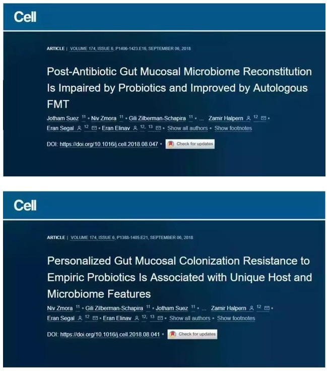 (标题分别为:常规益生菌肠粘膜定殖与宿主微生物组特性有关;益生菌损害使用抗生素后肠粘膜微生物组织的重建,但自体粪便微生物移植可促进重建 来源:Cell)