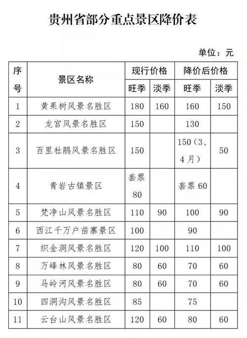 黄果树风景名胜区旺季门票价格由180元/人降为160元/人,淡季门票价格由160元/人降为150元/人;