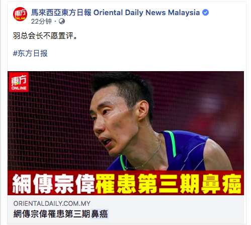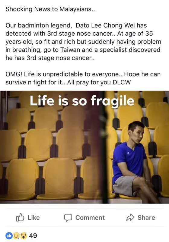 该网友在社交平台上写道:“这是一个对马来西亚足够震惊的消息。我们的羽毛球传奇,拿督李宗伟已经被检查出患有第三期的鼻癌。35岁的年纪,如此富有却遭遇突如其来的呼吸问题,去中国台北进行检查后发现患上了鼻癌且已经到达了第三期。。。”