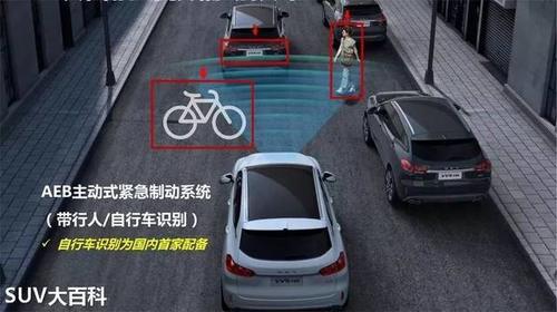 主动刹车,VV5升级款是首款在主动刹车识别中加入自行车识别的,比较适合国内的路况,对于突然出现的自行车,车辆也可以适时自动刹车。