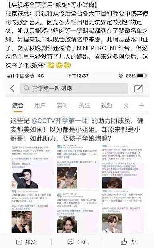 央视《开学第一课》中大量使用“娘炮”艺人作为参考,引起了很多家长的不满,大家认为这是在教坏小孩子,使他们开始学习这些"娘化“现象”,对此央视做出了道歉,随后更是发布了“限娘令”来限制这些“娘炮”艺人的登台。这次央视的做法得到了大家的肯定,大家纷纷为“限娘令”政策点赞。