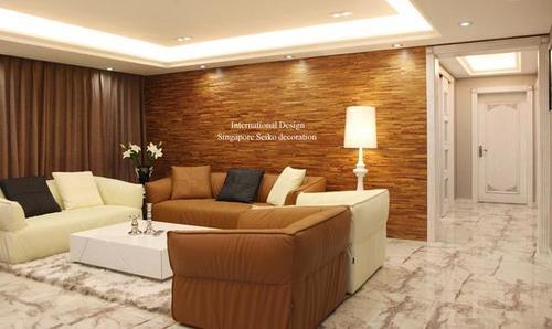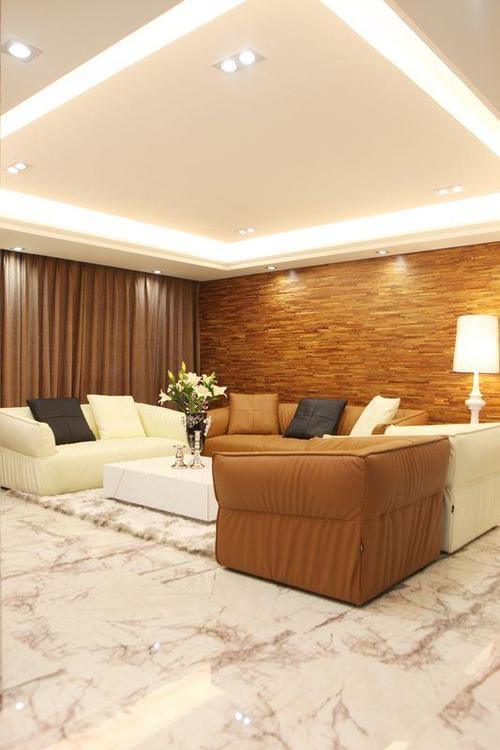 客厅背景墙是木地板上墙装饰的,主位沙发也是相近色的皮沙发,低调内敛中还多了些文雅。