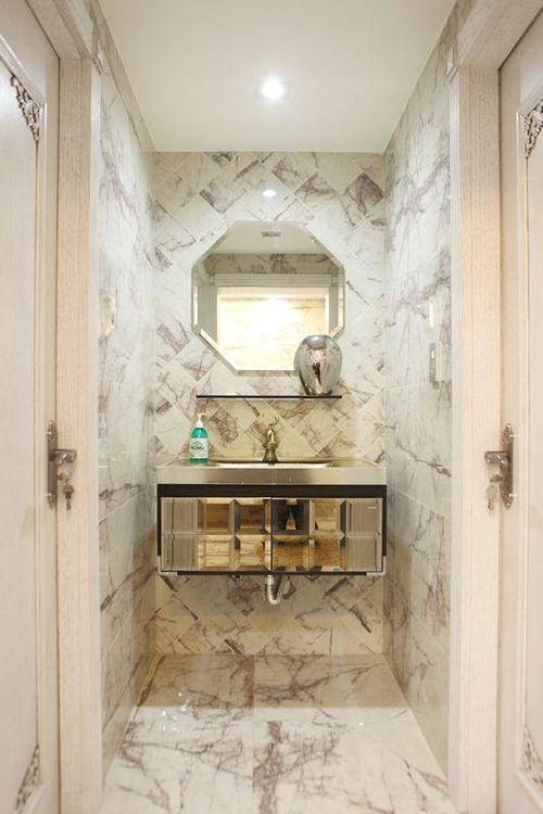 卫生间全贴着水墨纹瓷砖,还有些菱形格子拼花,有种摩登风味。玫瑰金色的洗手柜门板,时尚简约。