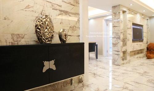 过道望去就能看到半截餐厅,地面和墙面是大面积的水墨纹瓷砖。