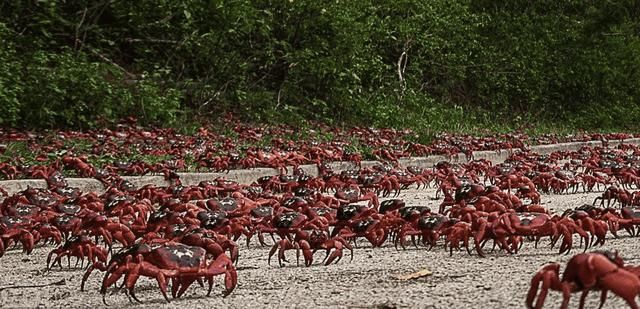 第三个地方是圣诞岛红蟹,这种螃蟹不同于我们日常吃的那种,而是含有毒素的品种,这也是它们可以在这里大肆繁衍的原因之一,在雨季到来之时,它们便会出现大型的迁移活动,这个时候岛上遍地都是它们红红的身影。