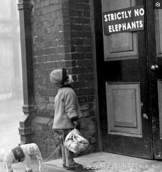 历史老照片:上面的字母是“大象不得入内”,而小孩牵着一头小象,很滑稽。