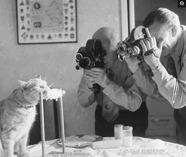 历史老照片:1951年,美国的一只猫在吃玉米,旁边的人用特殊设备观察它。