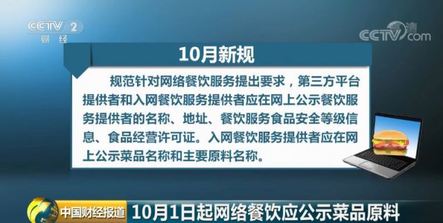 国家市场监管总局 7 月 23 日发布新修订的《餐饮服务食品安全操作规范》,自今年 10 月 1 日起施行。规范针对网络餐饮服务提出要求,第三方平台提供者和入网餐饮服务提供者应在网上公示餐饮服务提供者的名称、地址、餐饮服务食品安全等级信息、食品经营许可证。入网餐饮服务提供者应在网上公示菜品名称和主要原料名称。