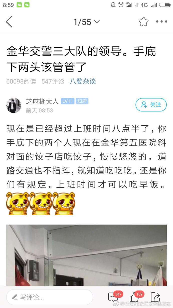 据@公安部交通安全微发布 消息,9月26日,网友“芝麻糊大官人”在本地某论坛中发帖质疑称“现在已经超过八点半了,交警三大队的两个交警还在金华第五医院斜对面的饺子店吃饺子……”并喊话交管部门“手底下的人该管管了”。