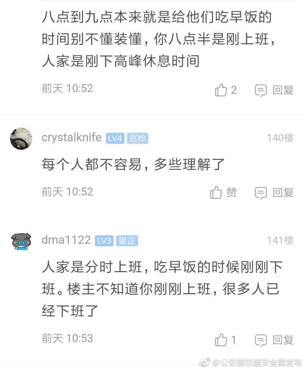 而众多网友看到这条帖子后,纷纷留言“教育”发帖人,“你八点半是刚上班,人家是刚下高峰时间”“八点半以后高峰期过了,吃点也正常,交警也是人哇!”
