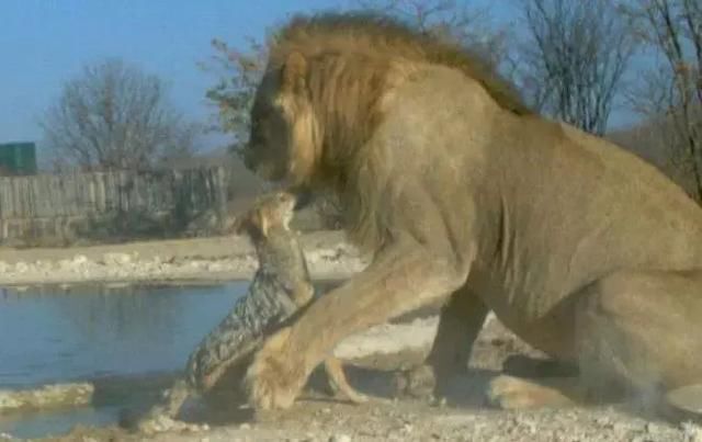 原本以为这头豺也只是在河边喝水顺道路过,结果这货在边上停了下来,还对着狮子“发飙”!别看雄狮已经老了,但是好歹也是猛兽啊,一巴掌就朝着豺招呼过去,这一对比差距就出来了,一条腿跟一头豺差不多大了!这差的可是有点多了!这也是狮子的资本!
