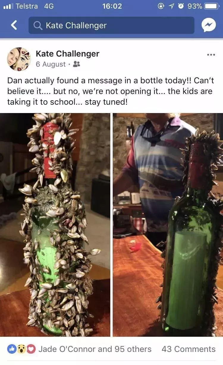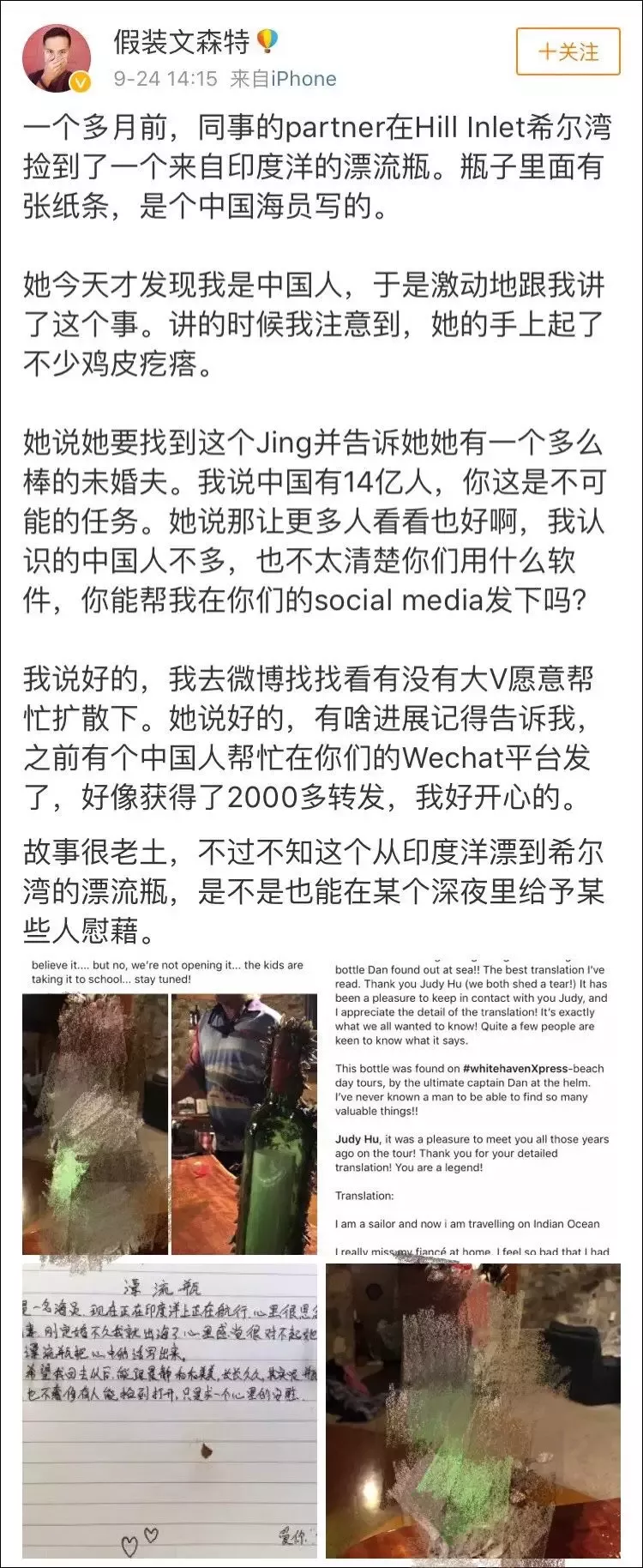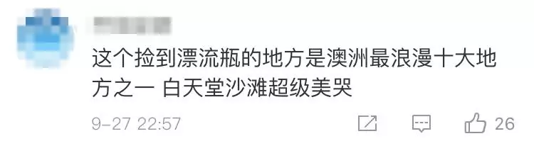 9月24日,网友@假装文森特在微博发文称,同事的小伙伴在澳大利亚的白天堂沙滩希尔湾捡到了一个来自印度洋的漂流瓶,瓶中有封中国海员写的信,向未婚妻"晨静"表达思念以及对未来生活的期冀,不少网友看见后感叹这份感情的美好和浪漫。
