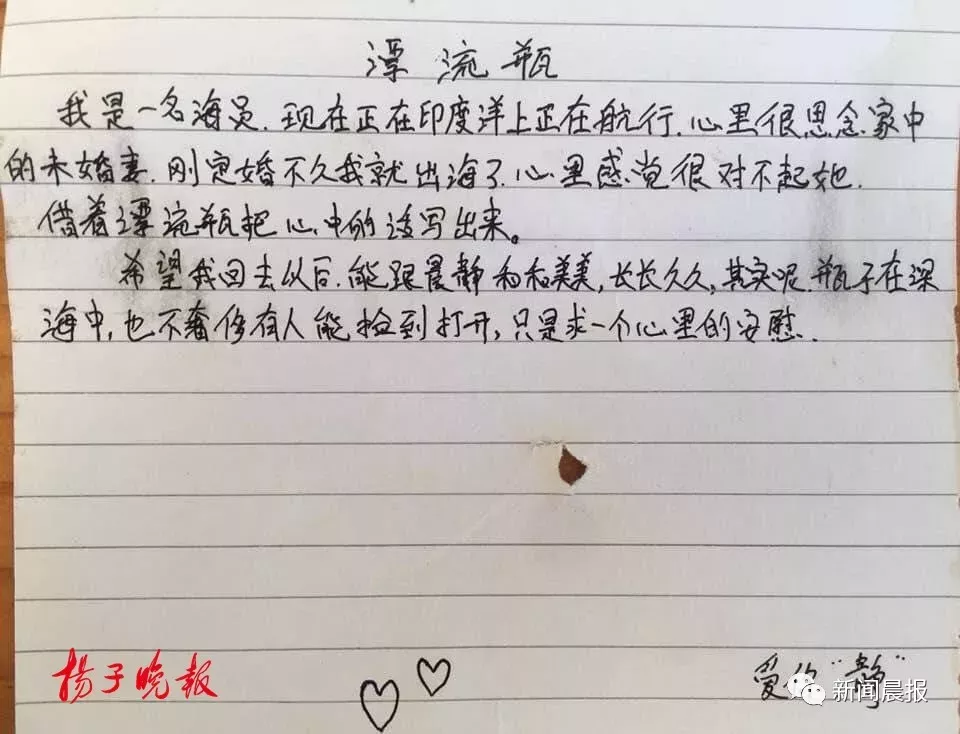 "我是一名海员,现在正在印度洋上正在航行,心里很思念家中的未婚妻,刚订婚不久我就出海了,心里感觉很对不起她,借着漂流瓶把心中的话写出来。希望我回去以后,能跟晨静和和美美,长长久久,其实呢,瓶子在深海中,也不奢侈有人能捡到打开,只是求一个心里的安慰。"