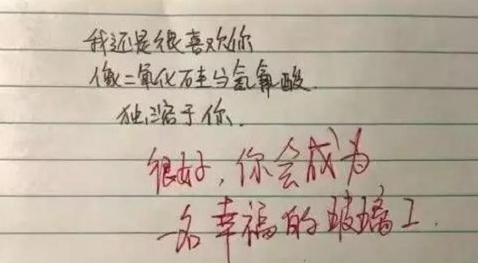 还有下面这个:很喜欢你,要想二氧化硅与氢氟酸独溶于你。可这二氧化硅与氢氟酸反应的产物又是啥?没点文化还真看不懂,现在学生们写的情书了。