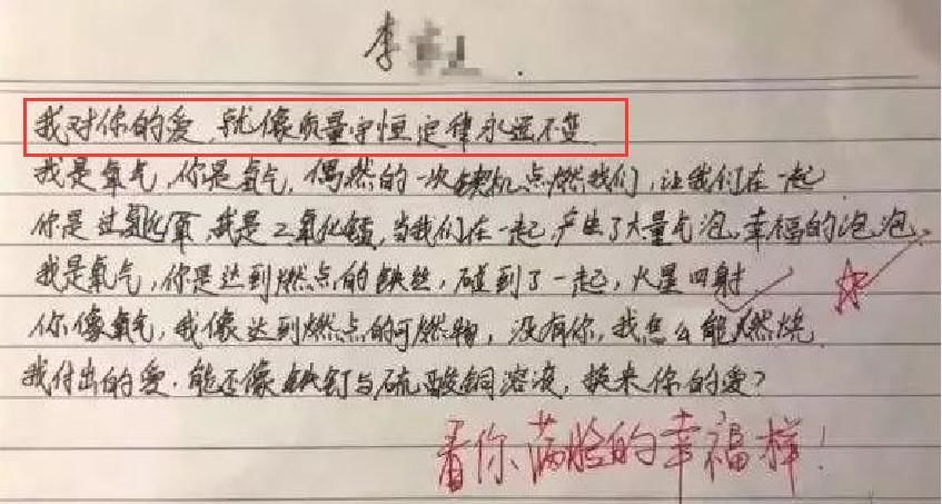 下面这位同学写的情书,就结合了自己的物理知识和化学知识,要是没有一定的知识功底还真写不出来这水平。