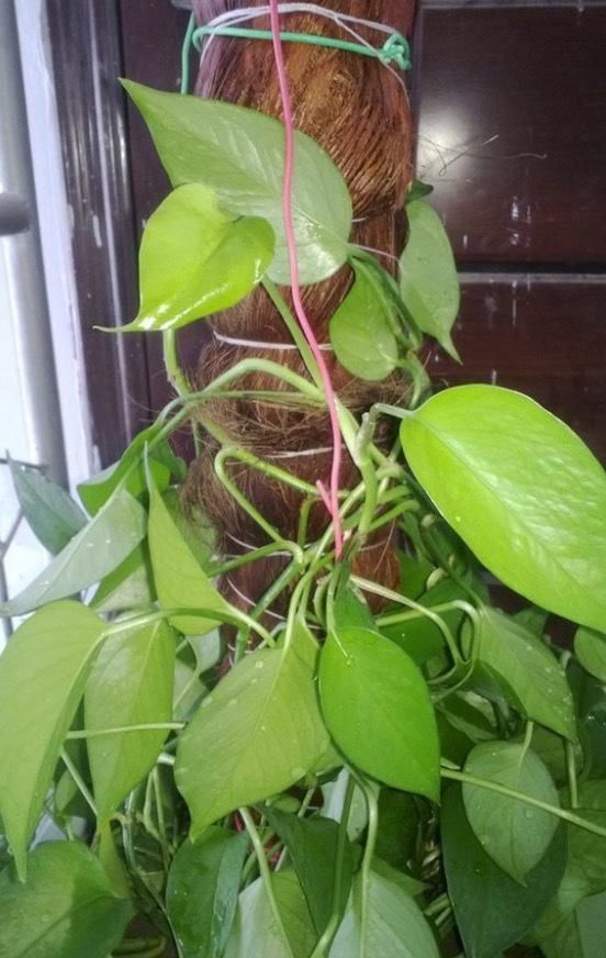 文章开头也说过了,绿萝叶片之所以大如扇,是因为在室外通过攀附数目枝干并长成老株,那如果我们在室内盆栽绿萝,没有树木供它攀附,那就只能找些替代品,比如绿萝柱。我们家里盆栽的都是绿萝幼株,这一点暂时没法干预,但是可以满足攀附和向上生长也可以让绿萝的叶片有所变化。