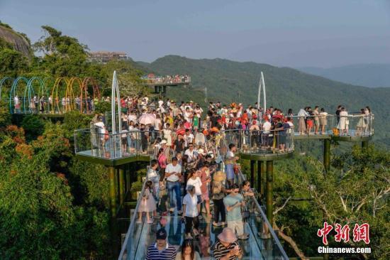 国庆三亚各景区人气火爆。图为游客挤满热带天堂森林公园玻璃栈道。 洪坚鹏 摄
