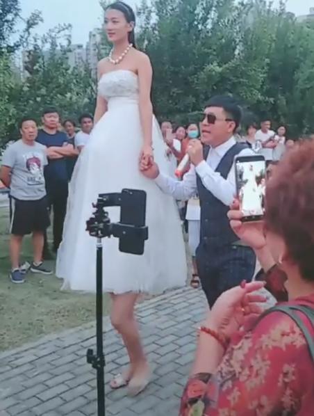 但是当大家看新娘的时候顿时不淡定了,因为新娘的身高让人吃惊,初步估计应该有2米多!这是怎么回事?大家看到后尖叫起来!小文在他身边显得很矮,大家都惊叹不已。