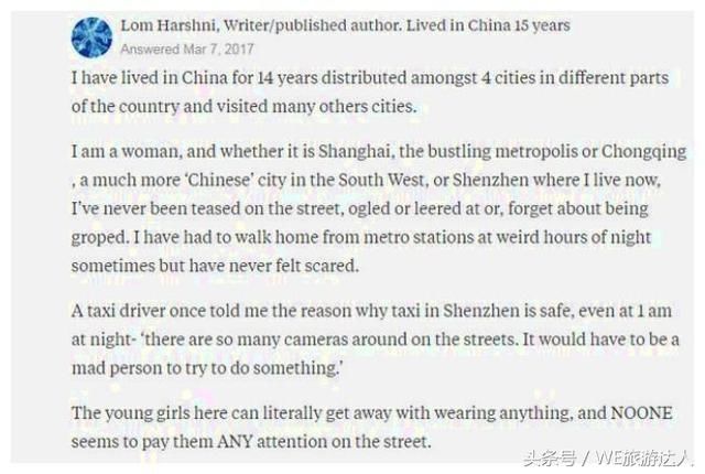 随着我国经济的不断发展,现在很多外国游客都来到中国旅行,然后把他们旅行的感受发布在网络社区中,之前有一个网友发布了一个"中国有多安全"的话题,于是很多来过中国的老外纷纷参与了讨论,那么在他们的心目中,中国到底有多安全呢?一起来看一下吧! 这是一位在中国生活了14年的外国友人的看法,在她看来,无论是在繁华的大都市,还是在一些小城市,都不会有人戏弄她,并且行走在路上也是十分安全的。而且这里的年轻姑娘无论穿什么都不会有人在意。
