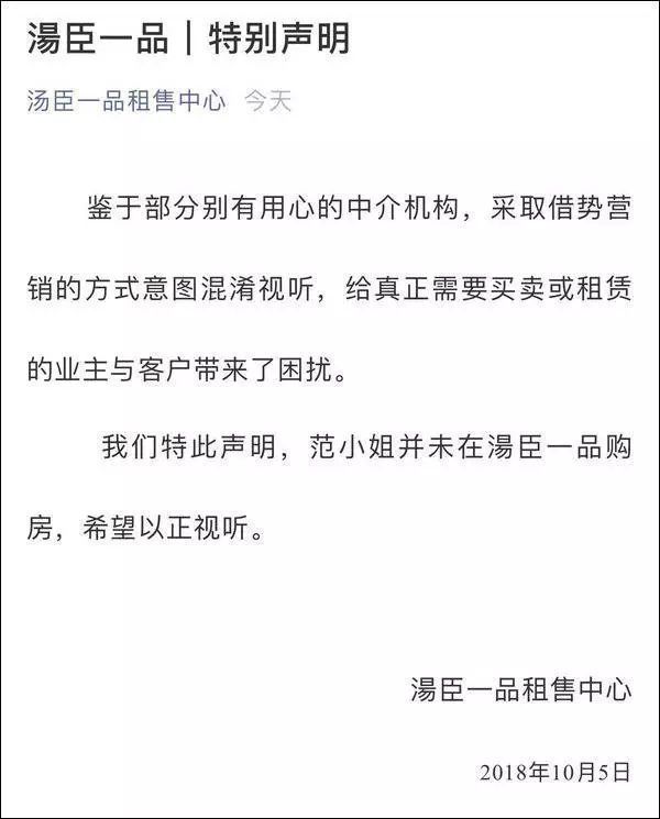 对此,汤臣一品租售中心5日发布声明称,范冰冰并未在这里购房,并称部分别有用心的中介机构,采取借势营销的方式意图混淆视听。