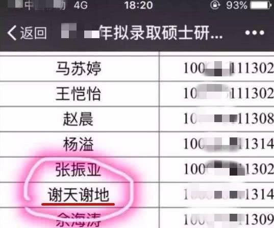 但是,最火的还是要数上面这个被录取为研究生的大学生,四个字的名字虽说并不少见,不过能够把姓氏和成语衔接地如此紧密,还真是头一回见,毕竟是“谢天谢地”。有网友说,这个“霸气”的名字,老师点起名来更像是在庆幸重获新生。还有网友看到以后戏谑地说,以前从不敢相信家长会给自己孩子取这种名字,现在终于相信不只有“熊孩子”,还有不少“熊家长”。