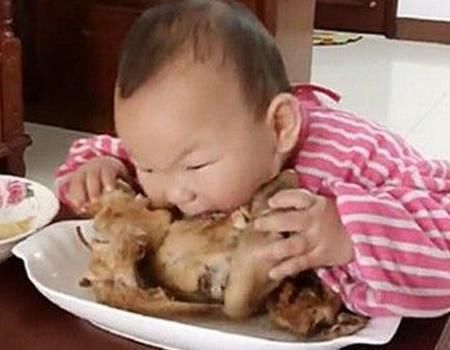 却看见眼前一幕不禁笑到肚子疼。可能是宝宝哭着出卧室找妈妈,结果被茶几上刚煮熟的猪蹄的香气给吸引了吧。然后小家伙没有忍住,然后就放开自己的嘴巴,大口大口的啃起来了。