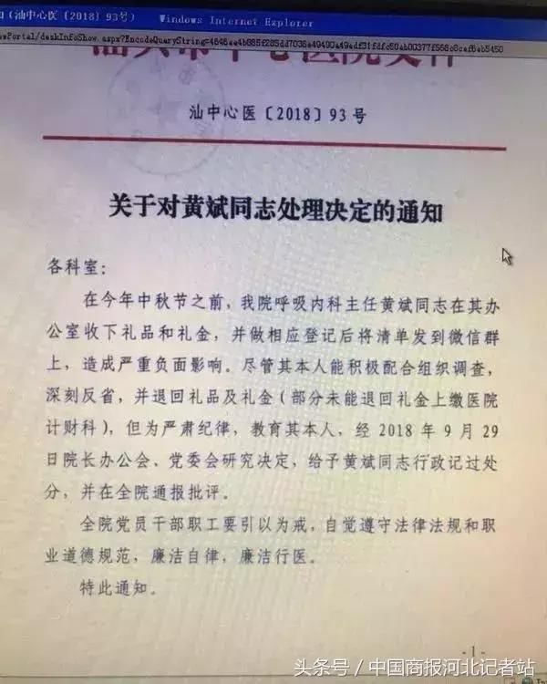 随后,这位黄主任也被医院调查处分了。根据网友拍摄的图片显示,汕头市中心医院发了《关于对黄斌同志处理决定的通知》,称此事造成了严重的负面影响,“尽管其本人能积极配合组织调查,并退回礼品及礼金,部分未能退回礼金上缴医院计财科。但为严肃纪律,教育其本人,经2018年9月29日院长办公会、党委会研究决定,给予黄斌同志行政记过处分,并在全院通报批评。
