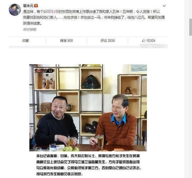 前几天,范冰冰刚被罚缴近9亿的巨款才刚刚过去,作为这次逃税案的举报者崔永元再一次出征了,开始对司马三忌挖根掘底,甚至直接微博点名。