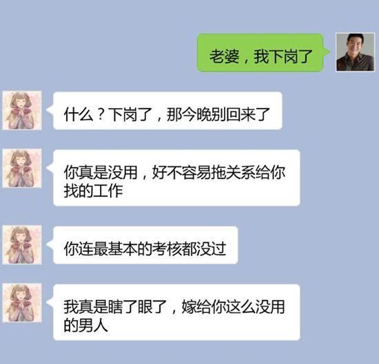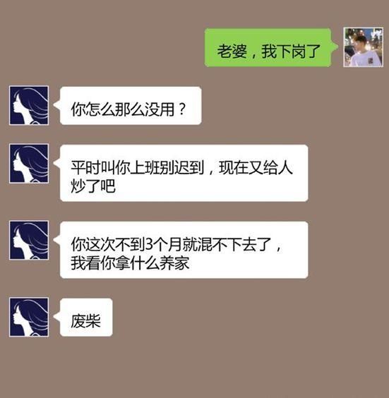 小编默默的心疼你三秒钟,可是估计你被骂也是活该的吧,听你老婆的语气,很明显你下岗已经不是什么新鲜事了,这次不到三个月就混不下去了,哎,其实小编想说的是,应该好好努力工作,尊严跟面子是靠自己挣回来的。
