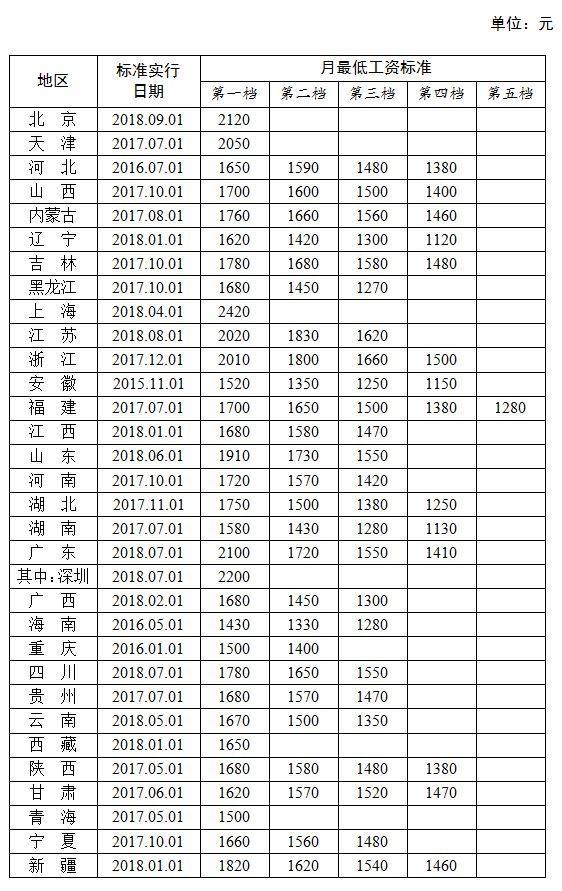全国各地区月最低工资标准情况(截至2018年9月),来源:人社部官网