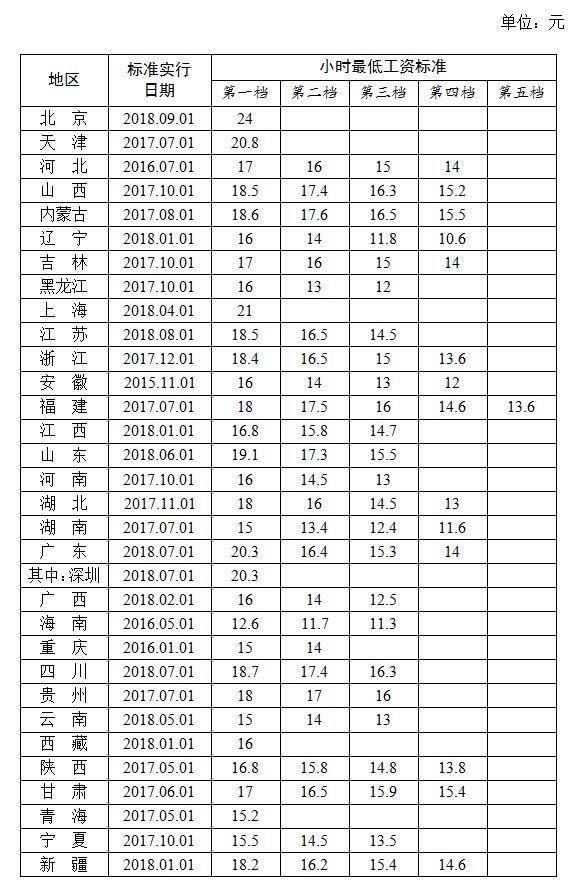 全国各地区小时最低工资标准情况(截至2018年9月),来源:人社部官网
