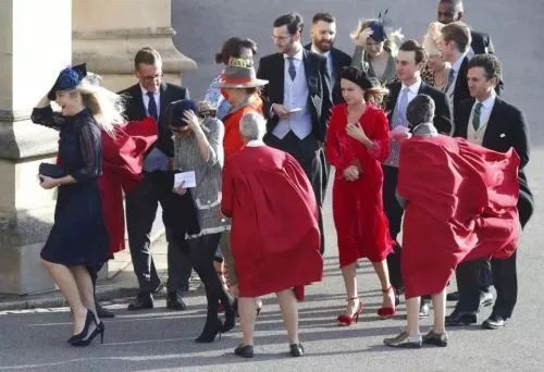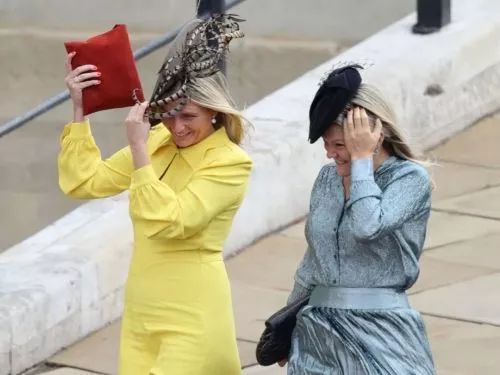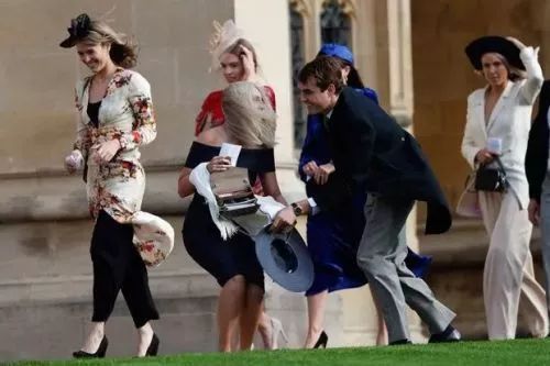 今天的婚礼现场,正逢妖风袭击全英,吹得来参加婚礼的名媛们都成了这种画风: