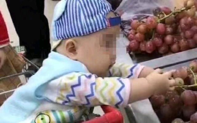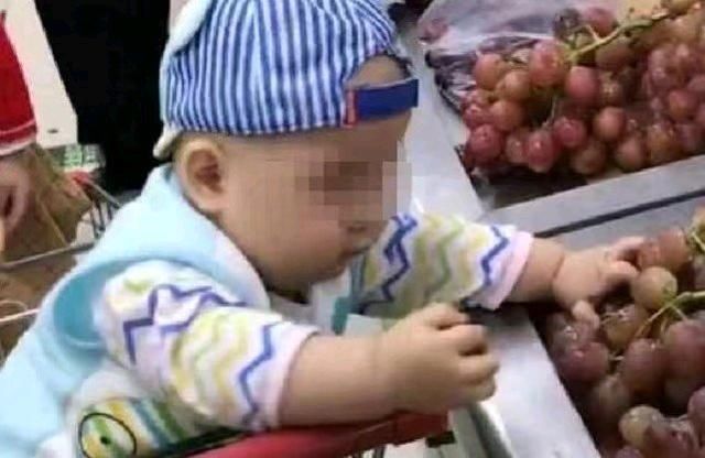 这一天,这位妈妈带着儿子去逛超市,儿子坐在购物车里。逛到水果区的时候,这位妈妈想挑选一些水果。孩子看到面板上放着很多新鲜的葡萄,看着甚是好玩,于是伸手出去一个个将其捏碎。路人看到后,默不作声,也不阻止。