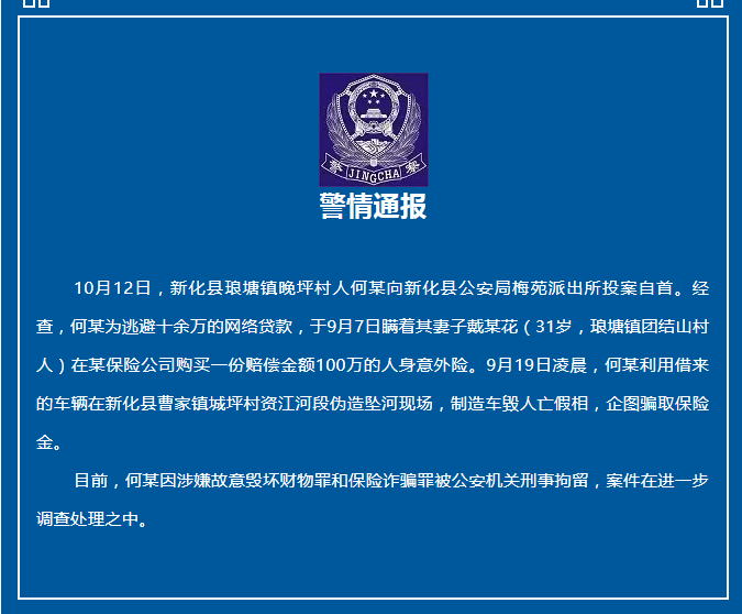 10月12日,新化县琅塘镇晚坪村人何某向新化县公安局梅苑派出所投案自首。经查,何某为逃避十余万的网络贷款,于9月7日瞒着其妻子戴某花(31岁,琅塘镇团结山村人)在某保险公司购买一份赔偿金额100万的人身意外险。9月19日凌晨,何某利用借来的车辆在新化县曹家镇城坪村资江河段伪造坠河现场,制造车毀人亡假相,企图骗取保险金。