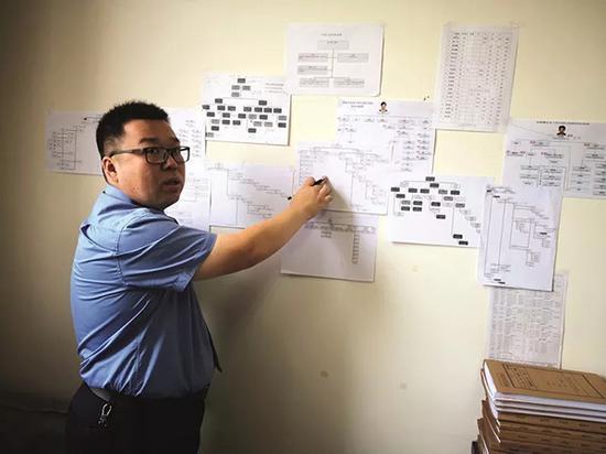 沈阳市浑南区检察院公诉科科长赵丹对记者介绍案情,墙上贴的都是"中国人际网"传销集团的组织网络图。
