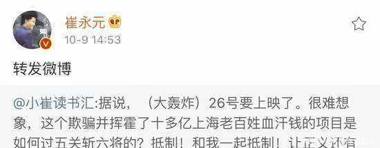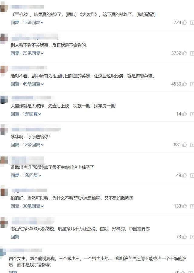 原本这部电影定档是8月份上线的,但因为FBB被立案查,因此片方不得不临时撤档,改在10月26日上线。但没想到,崔老师还是铁血无情,实名呼吁大家举报,对于这部电影,不少人也表示凉凉:“大轰炸就是大欺诈,先查后上映,罚款一批,送牢房一批!”“绝对不看,剧中所有为祖国付出鲜血的英雄,让这些垃圾扮演,就是侮辱英雄。”“别人看不看不关我事,反正我是不会看的。”……
