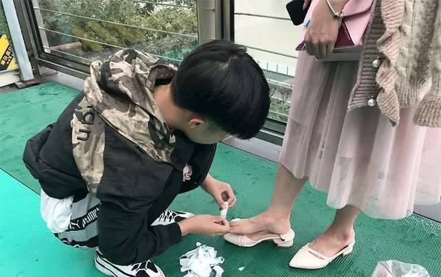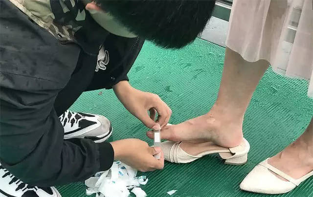 因为比较疼痛不便走路,男友很心疼,于是就跑到附近找了一家药店,买来了一包创可贴。当时天空下着雨,还是比较冷的,男孩蹲在地上小心翼翼帮女友贴脚指头。他又担心脚趾又被鞋子磨破,于是就把每一个脚趾头全用创可贴给包住了。