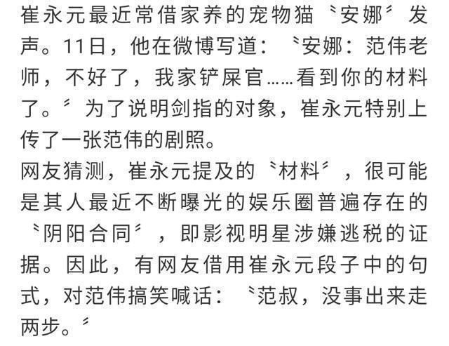 前段时间,崔永元在微博上写道:“安娜:范伟老师,不好了,我家铲屎官……看到你的材料了。”并配上了一张猫的图片和一张范伟的图片。