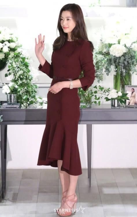 像这身酒红色的鱼尾裙看起来更加高端大气,修身的款式将身材展现的十分性感迷人,搭配藕粉色高跟鞋与酒红色鱼尾裙成鲜明对比,一举一动显得格外优雅、端庄。话说如此百变的全智贤你们喜欢吗?