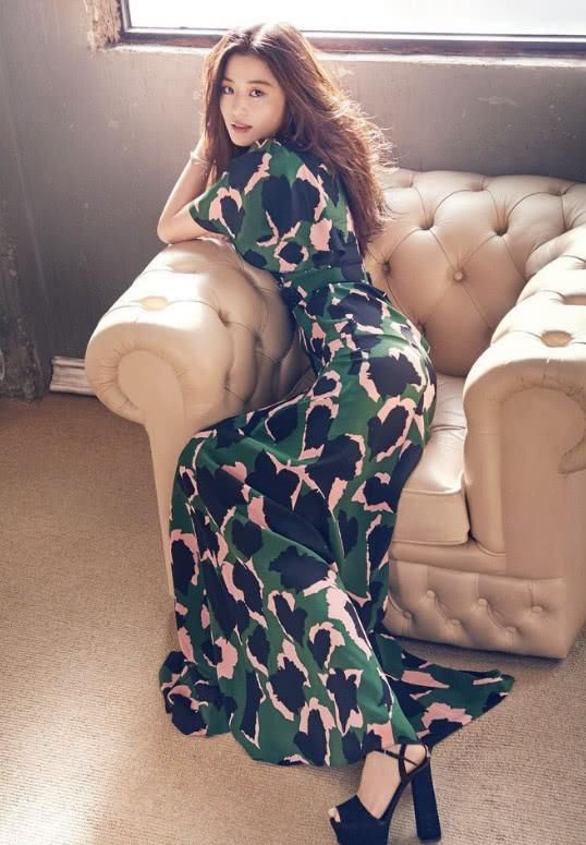 身材好的全智贤无论什么风格的衣服都能轻松驾驭,像这件墨绿色长裙十分优雅又大气,加上心形图案的点缀显得更加时尚,脚踩黑色高跟鞋彰显出满满的女人味,秀丽的长发配上这一抹精致的妆容简直女神范十足啊!