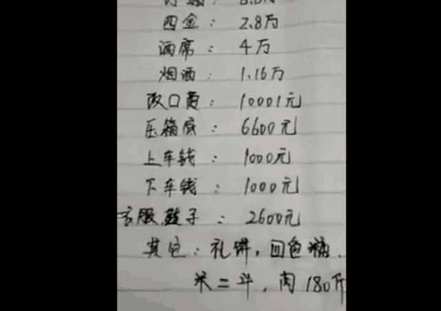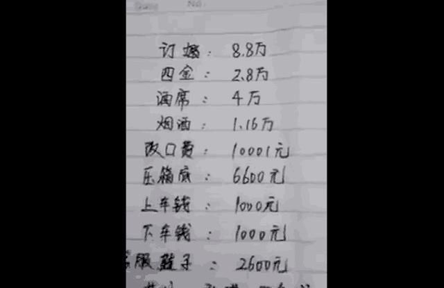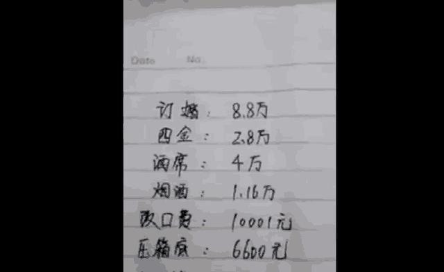 家长们的出发点虽然是好的,但是彩礼这个话题让多少的情侣本来已经准备走进婚姻的殿堂了,却被这个高价的彩礼阻拦了,还有很多的情侣因为彩礼钱最后各奔东西,错过了今生的挚爱。小刘跟自己的女朋友也准备结婚了,就在上女朋友提亲的时候,丈母娘直接列出了一张彩礼清单。