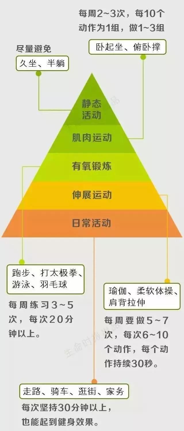 运动量够不够,是运动强度和运动时间共同决定的。一般来说,日常的运动量,可参考下面这个金字塔。