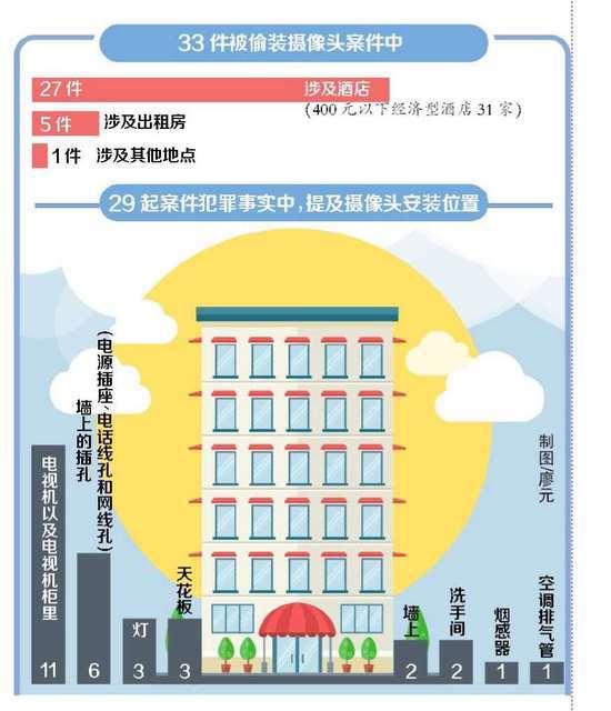 记者通过国内各地法院查询到酒店、出租房等房间内被偷装针孔摄像头的案件达33件。多名法官表示,案件的绝对数量不多是因为此类案件极具特殊性和隐蔽性。
