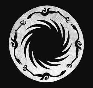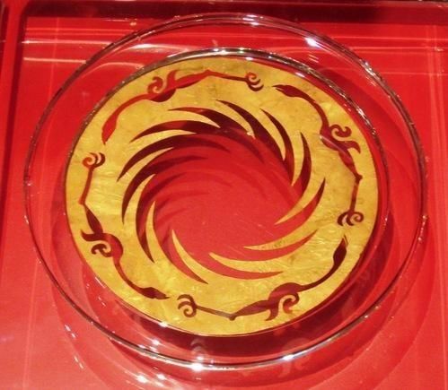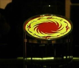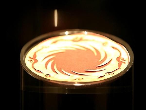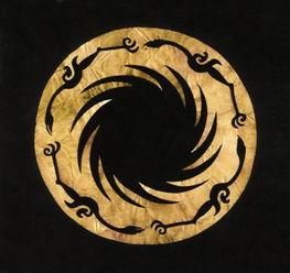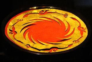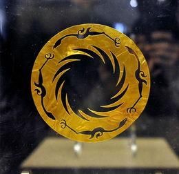 此展品为商周时期的金器,呈圆形,器身极薄。图案采用镂空方式表现,分内外两层。内层为一圆圈,周围等距分布有十二条旋转的齿状光芒;外层图案围绕在内层图案周围,由四只相同的逆时针飞行的鸟组成。现收藏于成都金沙遗址博物馆。