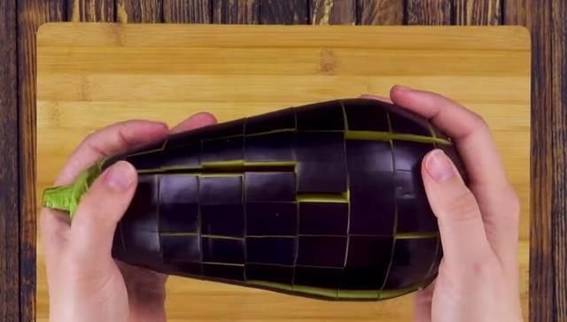 首先准备好一个黑美人茄子,茄子的种类有很多,有长茄子、中长茄子,黑美人茄子等,黑美人茄子比较短,但比较粗,所以做这道小吃非常的合适,茄子准备好后,清洗干净,然后把茄子的表面切上一些小方块。