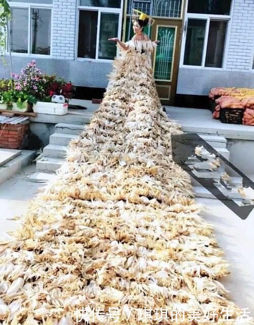 就这样过了3个月,家里人再看到这些玉米皮的时候,都被惊艳到了。原来小杨用这些玉米皮做了一件凤袍,有十几米长,一直从门口能拖到院子口,小杨站在屋顶上的时候,这件凤袍美爆了。你们觉得小杨的这个创意怎么样?