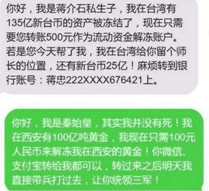 这个骗子实在是太有意思了,他竟然敢自称是蒋-公的私生子,难道他想让那些贪图虚荣者给他打钱?这个人的回答也非常的搞笑,跟这个骗子现学现卖,这个骗子竟然回复了让自己身份暴露的话。