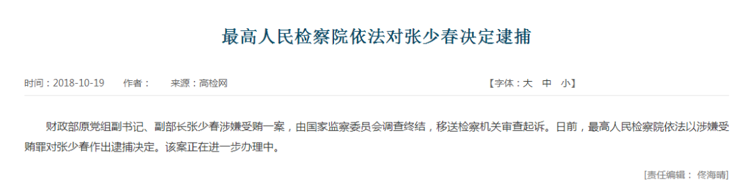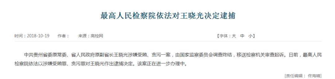 还有2人被检方决定逮捕——10月19日,最高检依法对贵州省委原常委、原副省长王晓光和财政部原副部长张少春决定逮捕。