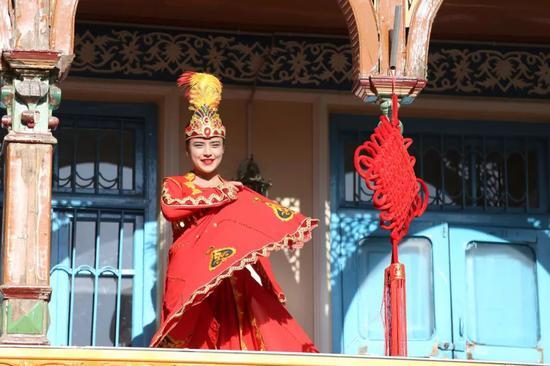 ▲23日,喀什古城内的一家剧院,一位维吾尔族姑娘正穿着漂亮的民族服饰