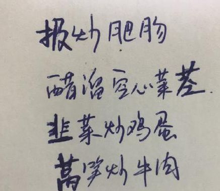 这时候他才发现,女孩写的菜单是“报炒肥肠,醋溜空心菜茎,韭菜炒鸡蛋,莴笋炒牛肉”,老板这时候才想到,女孩干嘛把菜名写错了呢,把难的字写成容易写得很章程,但是会把日常用的字,写成其他的,就有点值得怀疑了。